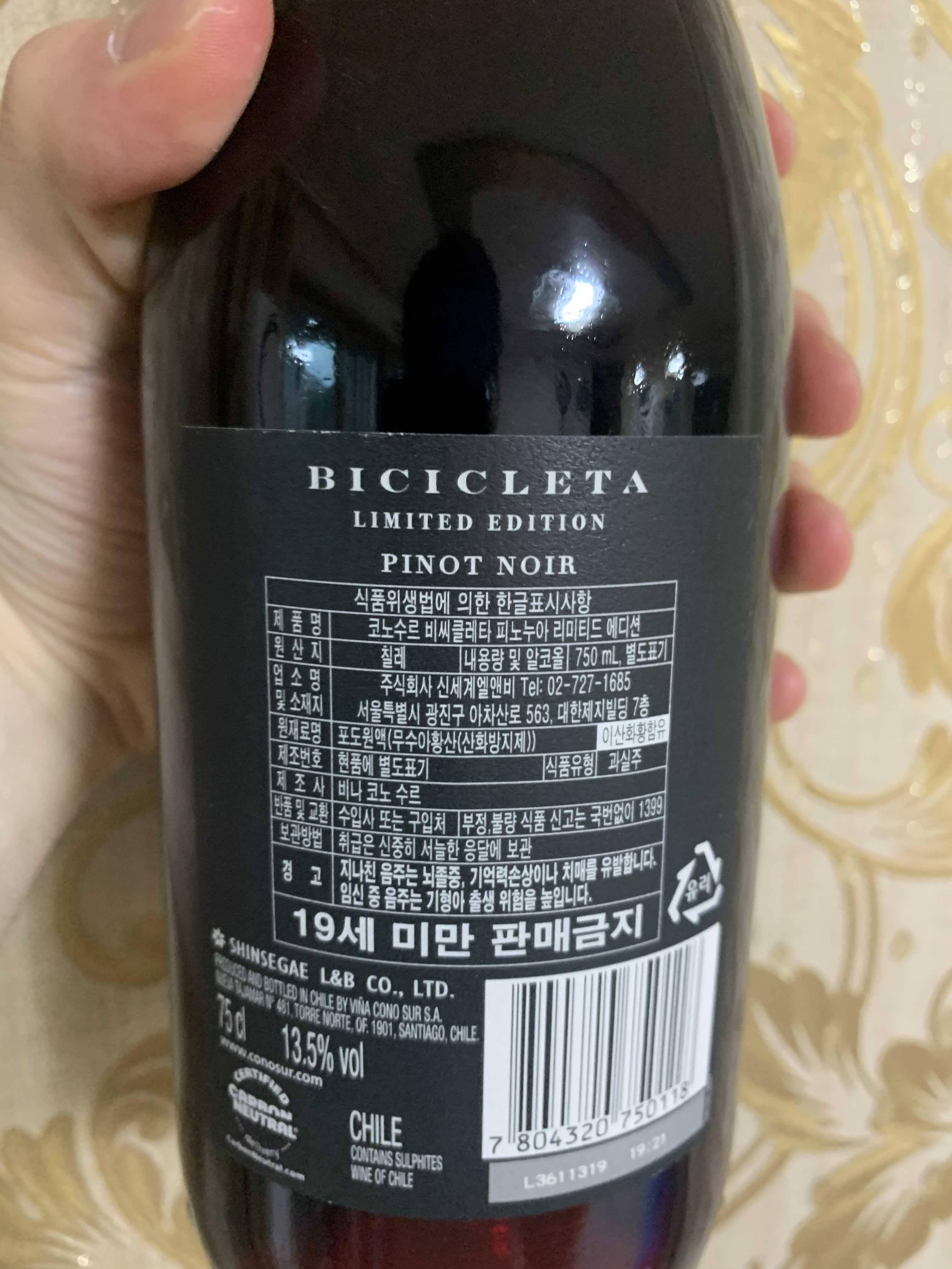 이렇게 기울여서 보니까 색이 진한 보라색보다 더 연한 느낌이 나네요!! 이마트 24에서 구매하기 좋은 와인을 추천드렸습니다. 이마트 24 편의점 와인 추천!! 코노수르 비씨클레타 피노누아 리미티드 에디션이라서 나중에는 구매하기 힘들 지도 모르겠네요!