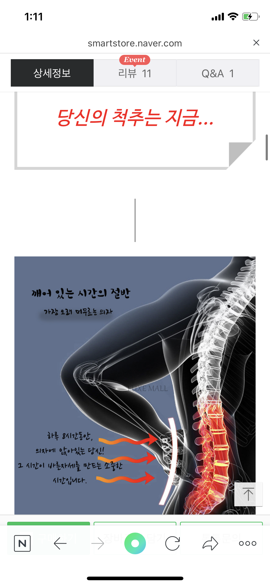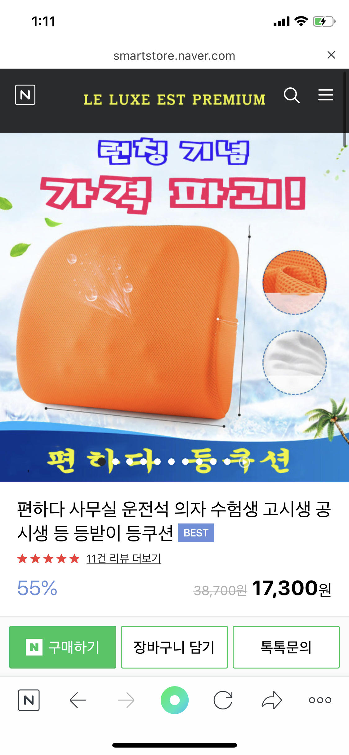 네이버페이로 구매를 했고 제가 구매할때의 가격은 55%할인된 17300원으로 판매를 하고 있어요!! 이름은 편하다 사무실 운전석 의자 수험생 고시생 공시생들을 위한 허리 등받이 쿠션이에요!!