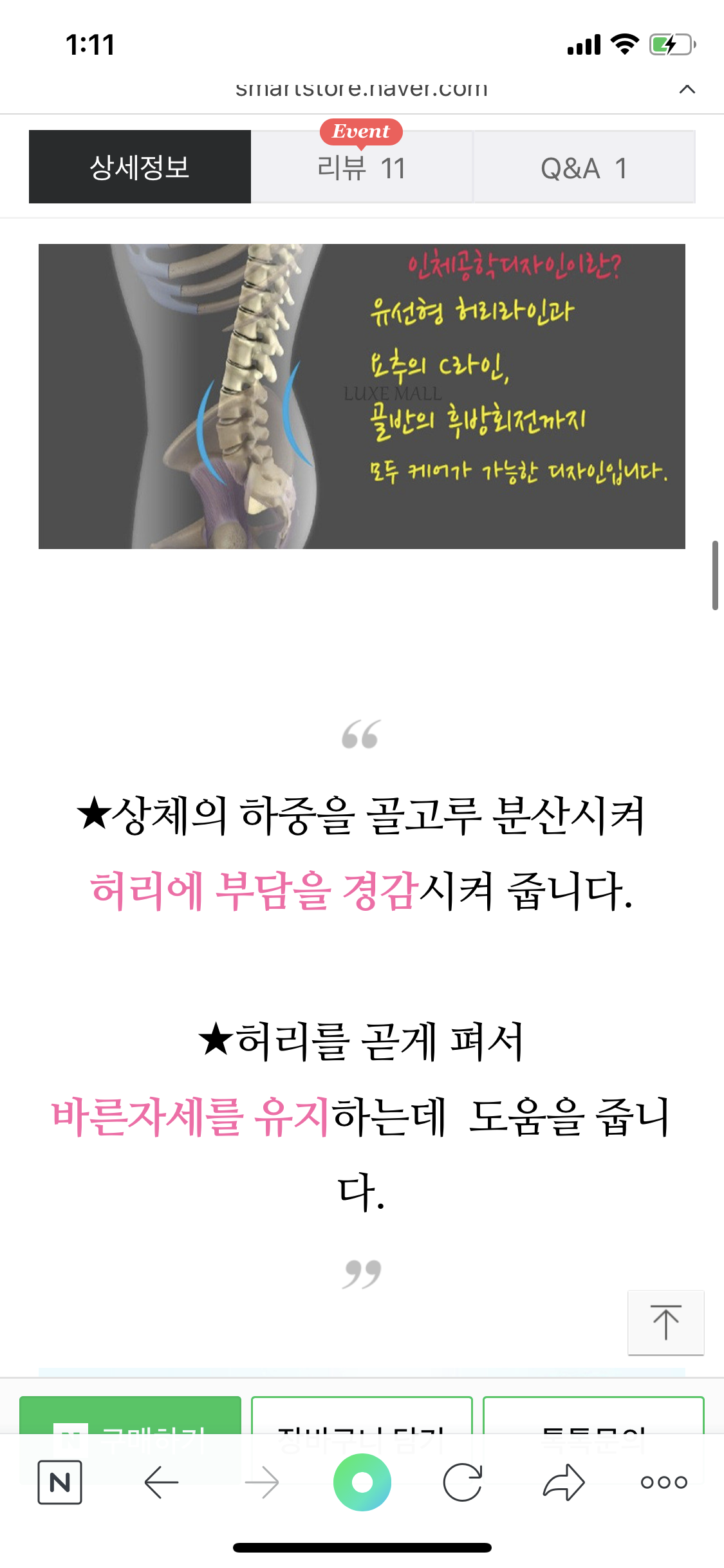인체공학적 디자인이란 유선형 허리라인과 요추의 C라인, 골반의 후방회전까지 모두 관리가 가능한 디자인이라고해요!! 허리 등쿠션은 저희 사무실사람들도 대부분 이용한답니다!!