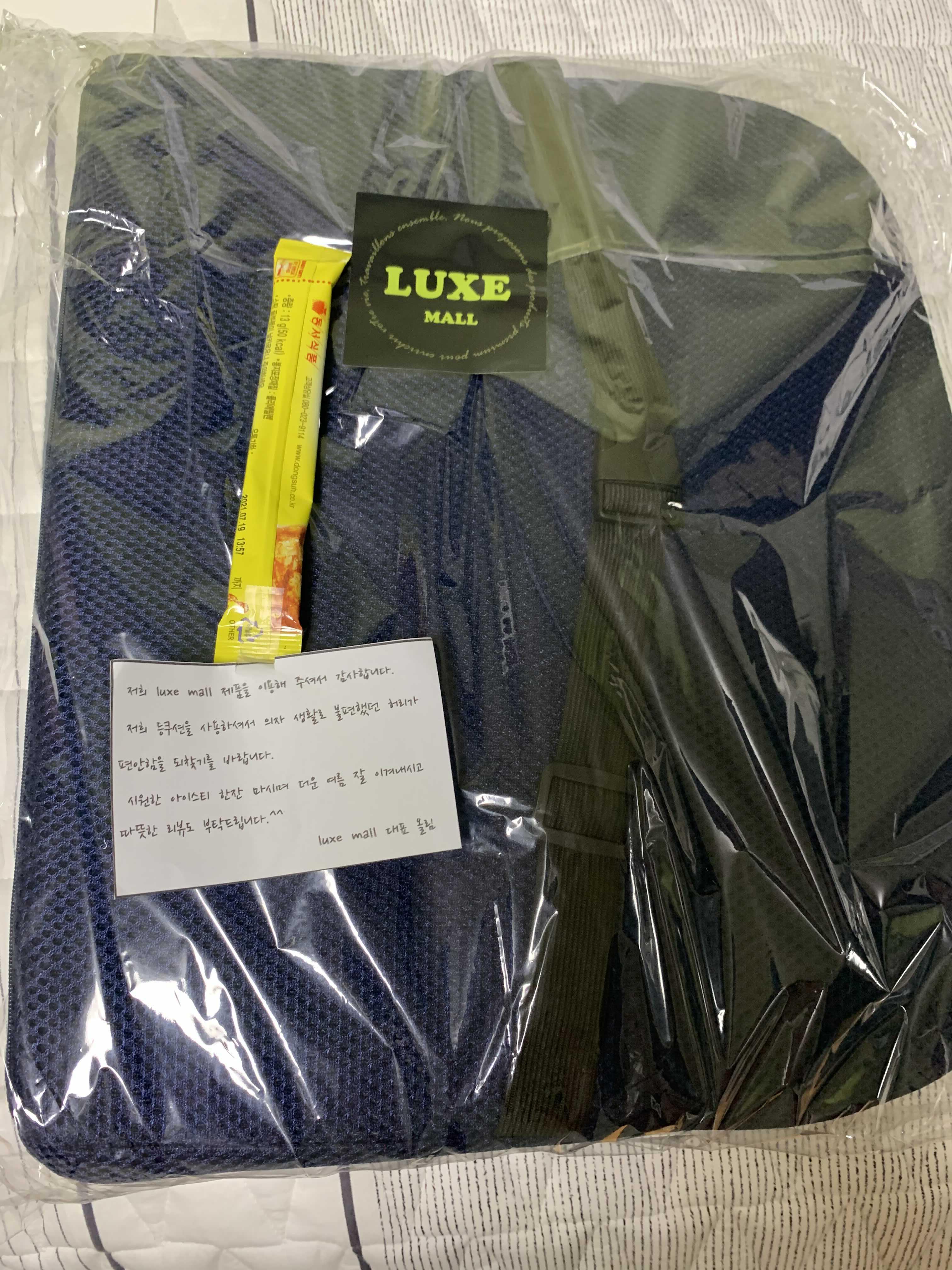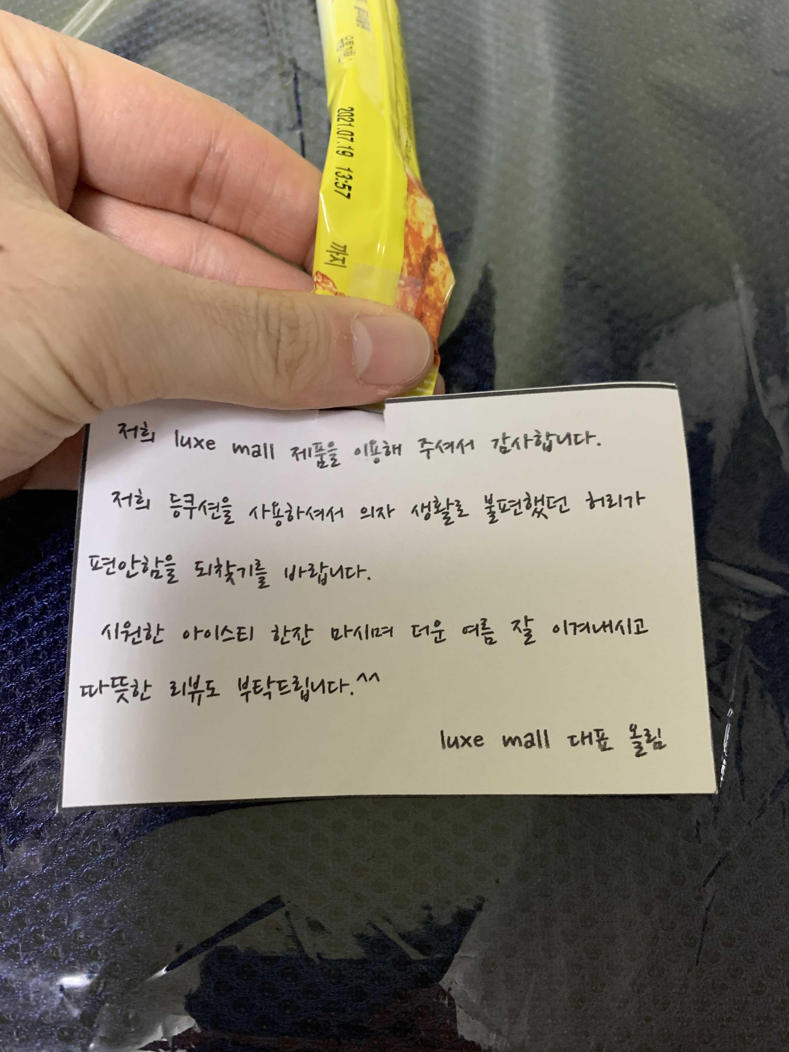 이게 배송 온 허리 등쿠션입니다!! 친절하게 작은 편지와 아이스티를 주셨네여 ㅎㅎ
