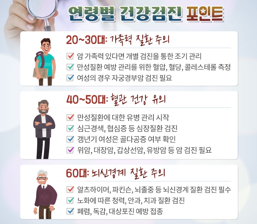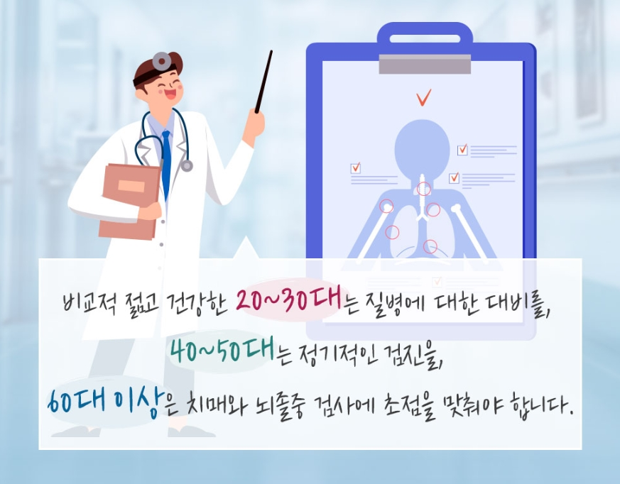 20대와 30대는 비교적 젊고 건강하기 때문에 질병에 대한 미리 대비를 해야합니다!! 40대와 50대의 건강검진 항목은 정기적인 검진으로 준비를 해야죠!! 그리고 노화가 진행되는 중인 60대는 치매와 뇌졸중 검사 등에 초점을 맞추어야 합니다!!