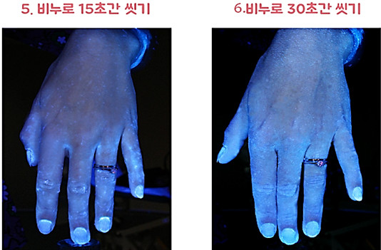 30초간 손을 씻었을 때는 손톱아래 세균까지 거의 제거된 모습을 볼 수 있습니다. 코로나 확산에 따른 개인위생을 지키기위해서는 비누를 이용해 30초이상 손을 씻고, 확실히 말리는 것이 중요합니다.