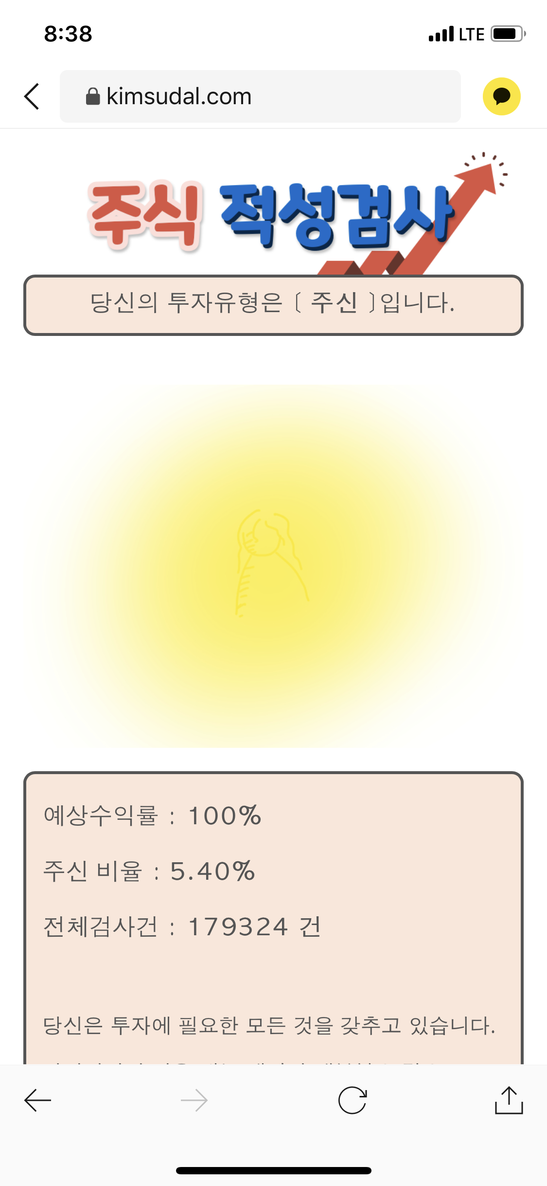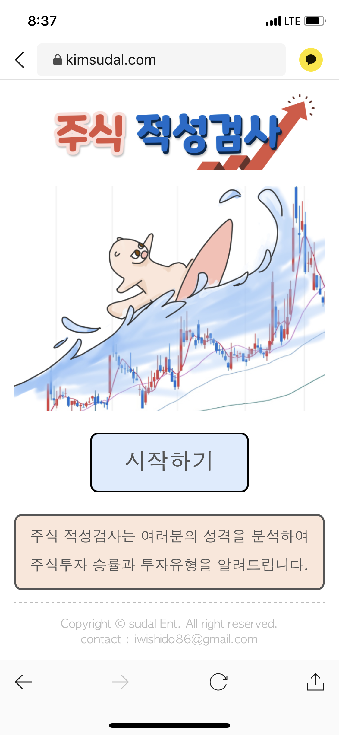 이제 시작입니다!! 주식적성검사는 여러분의 성격을 분석하여 주식투자의 승률과 투자유형을 알려준다고 하네요 ㅎㅎ!!