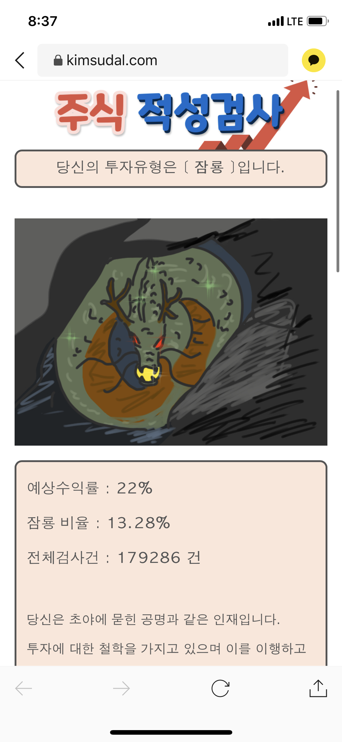 이 검사는 MBTI검사에 기반하고 있습니다. 당신은 주식투자에 유리한 성격입니다만 단기투자에서 누구도 시장을 이길수 없다는 걸 명심해야합니다.