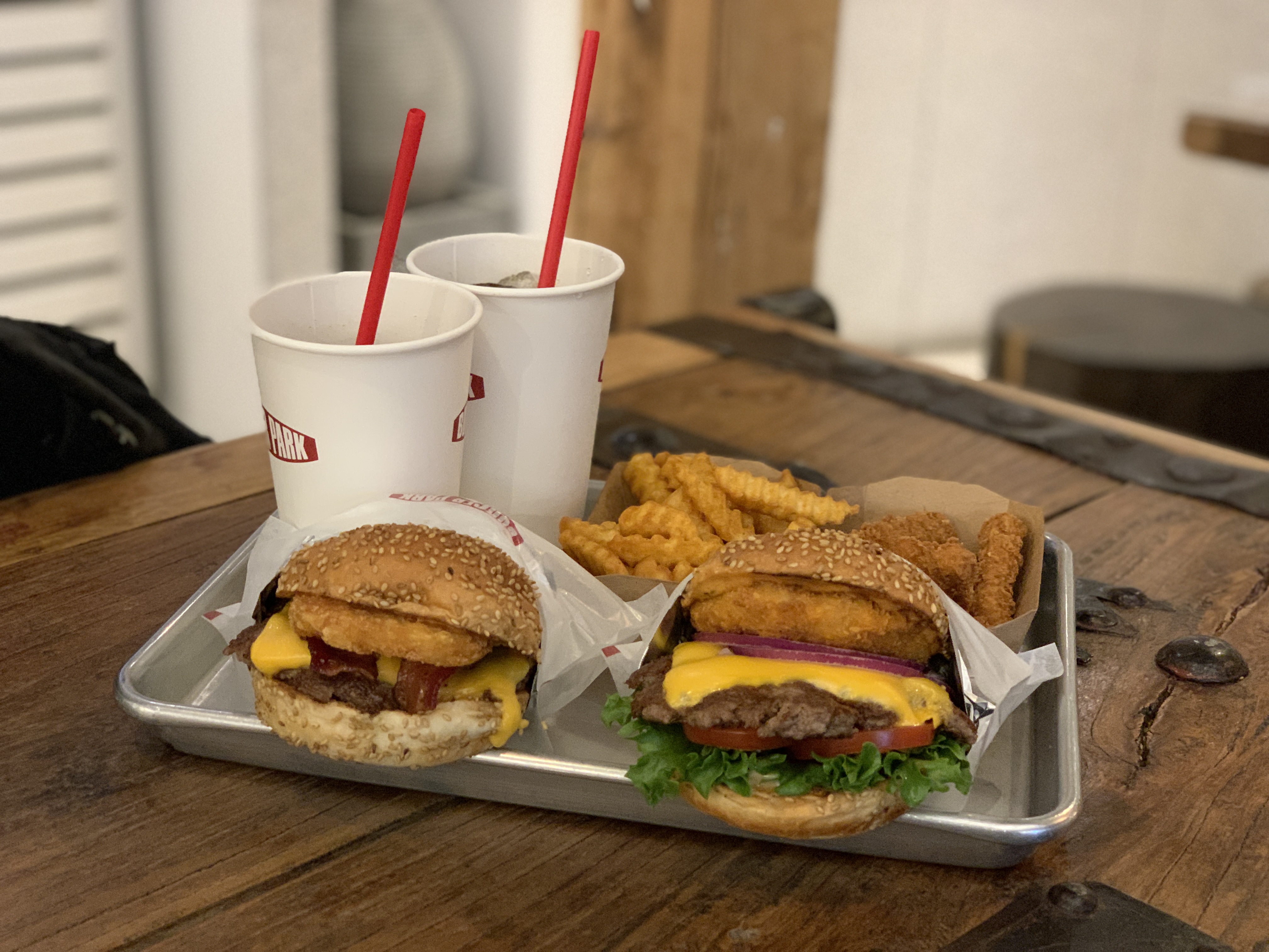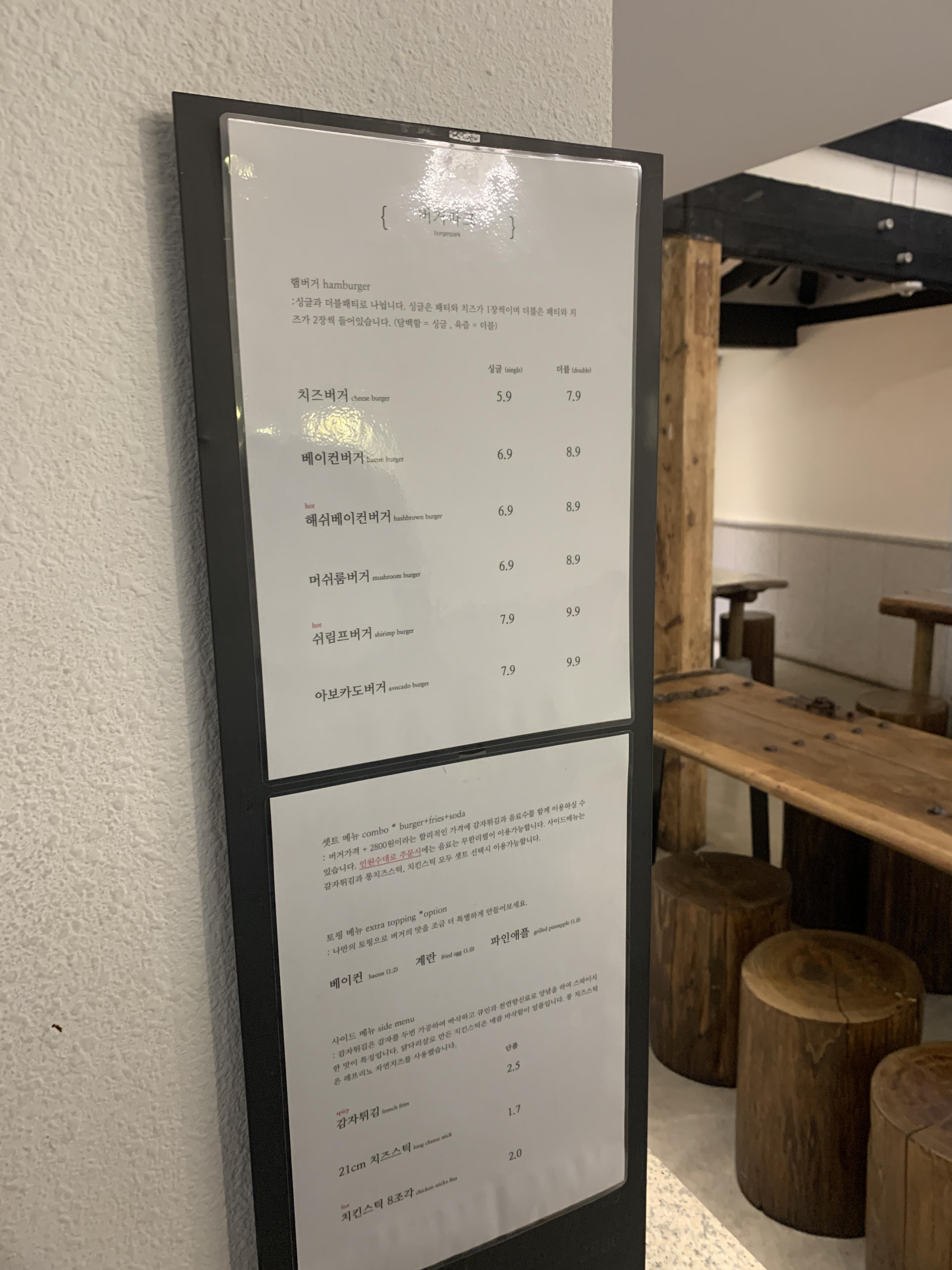 이렇게 버거파크의 로고가 있고 Burger Park라는 네온사인이 있네요!! 한 저녁 9시경에 방문했고 코로나가 400명 정도 나오는 시기어서 사람은 거의 없었어요!! 한테이블 정도?? 있었습니다 ㅎㅎ