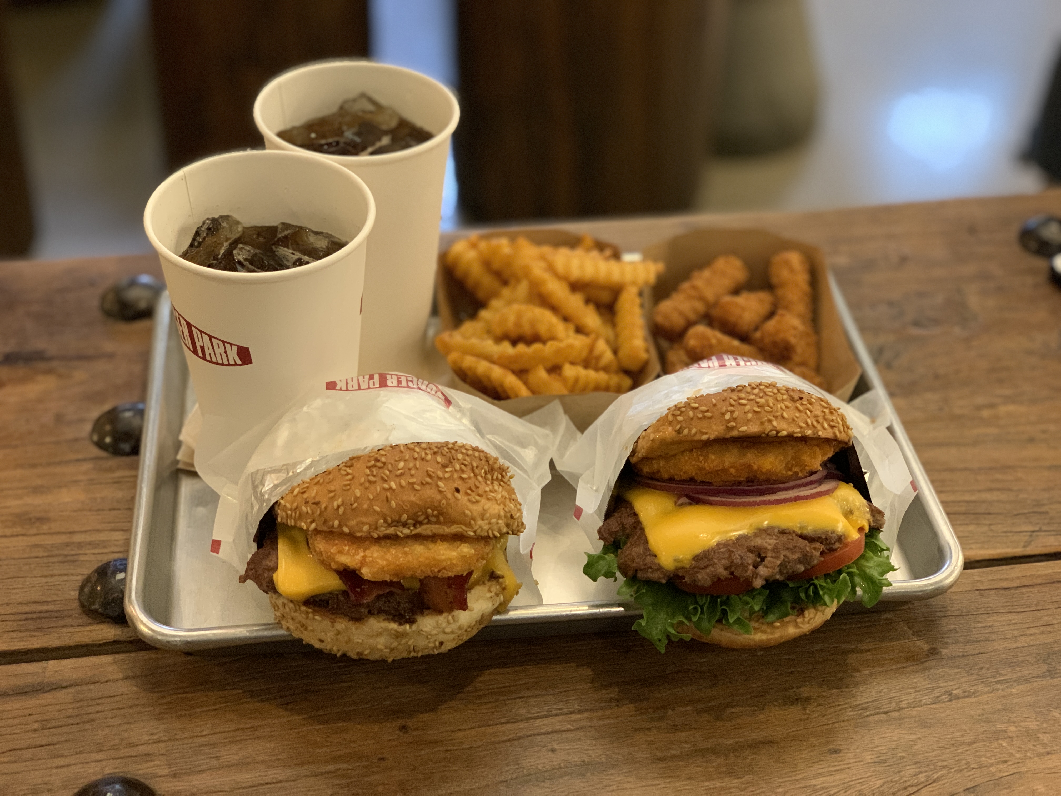 이것이 대학로 수제버거 버거파크에서 주문한 해쉬베이컨버거 세트와 쉬림프버거 세트에요!! 그리고 뒤에는 감튀하나와 치킨하나입니다!!@@