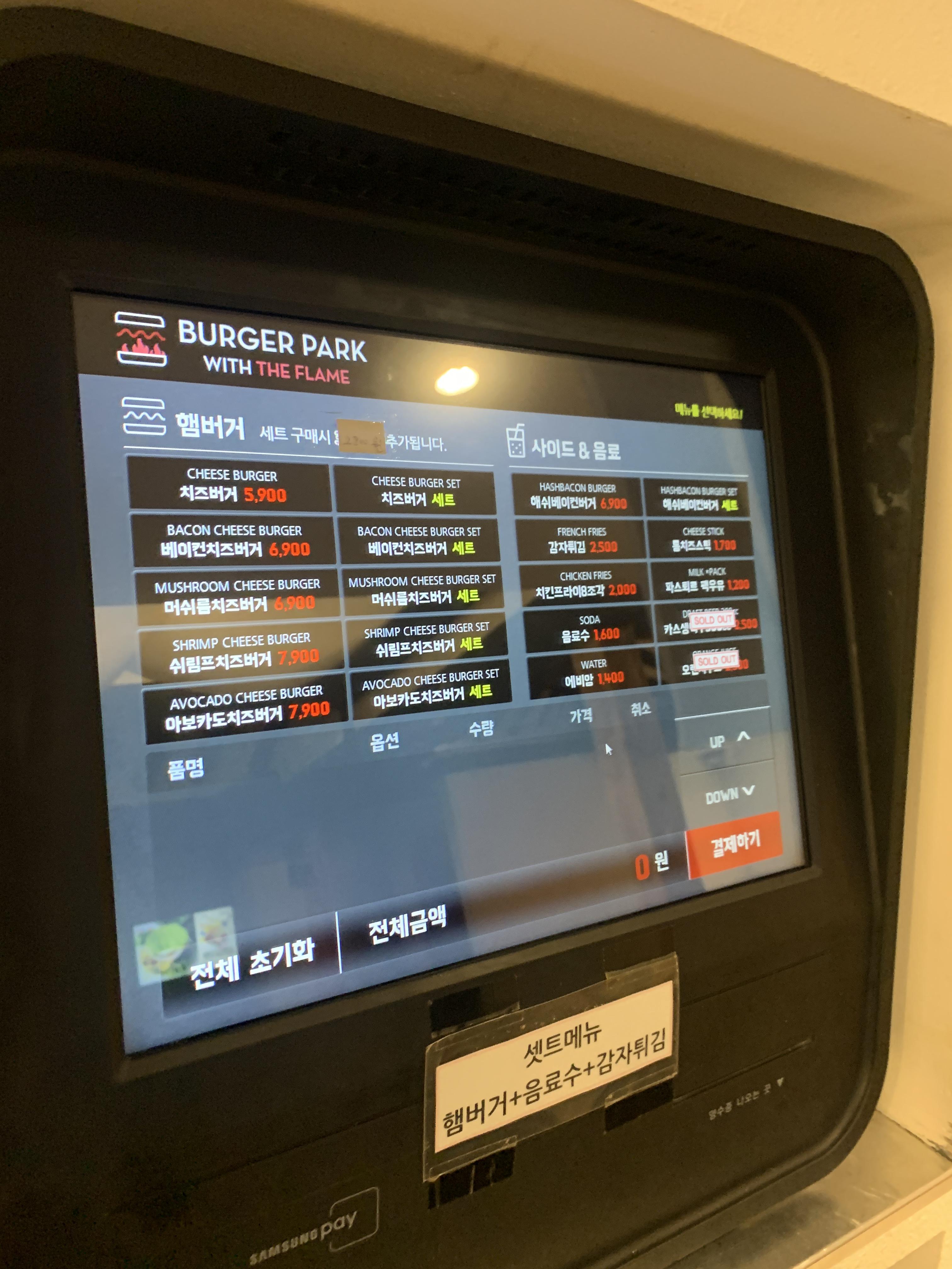 혜화 수제버거 맛집!! 버거파크는 키오스크를 통해 주문이 가능합니다!! 셋트메뉴는 햄버거+음료수+감자튀김을 주문했습니다 ㅎㅎ가격이 생각보다 저렴하더라고요 ㅎㅎ 이날 맥도날드를 먹고 싶었지만 수제버거를 먹자고 한 친구의 말에 수제버거를 주문하기 잘했습니다@!