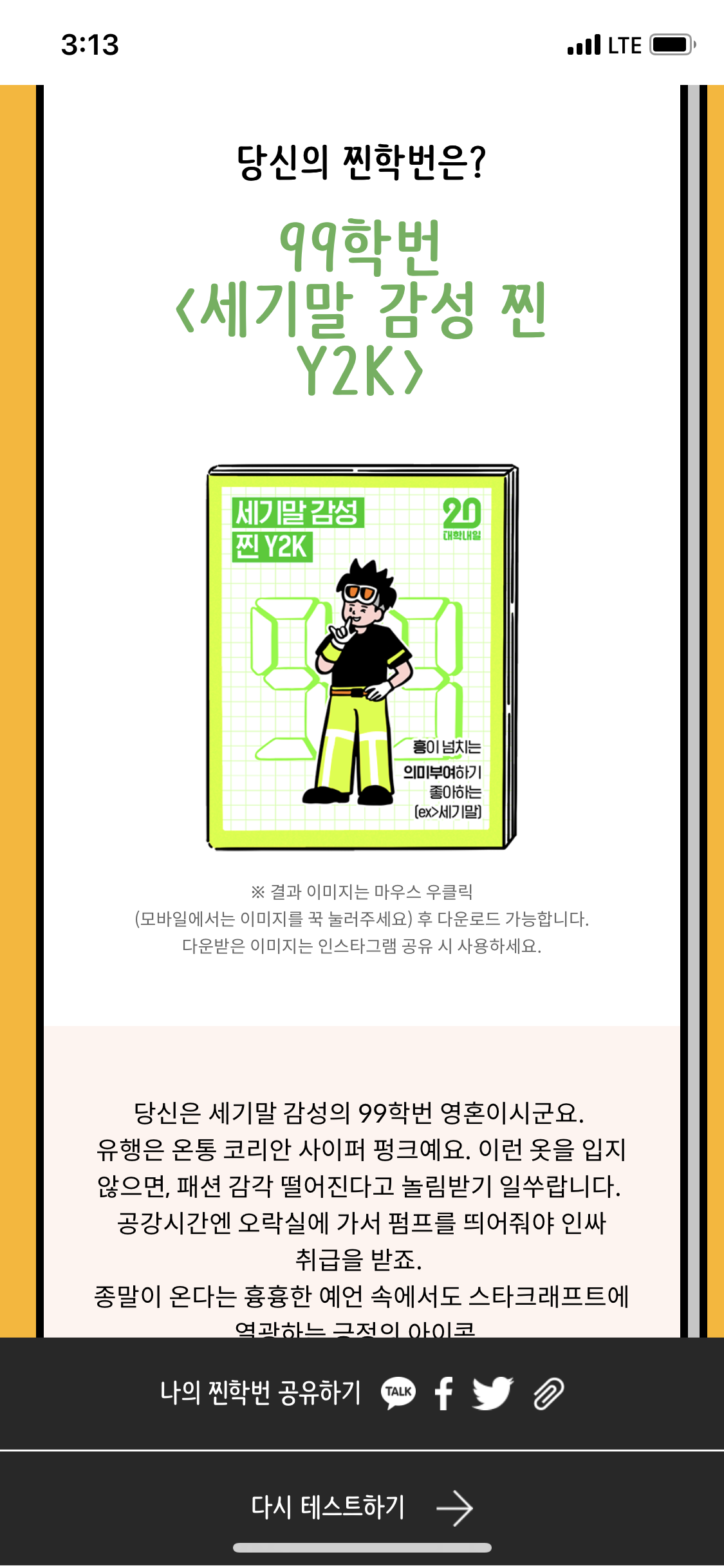 저는...99학번 세기말 감성찐 y2k 가나왔네요 ㅎㅎ세기말 감성이라니 나름 10년도 이후 학번인데... ㅠㅠ