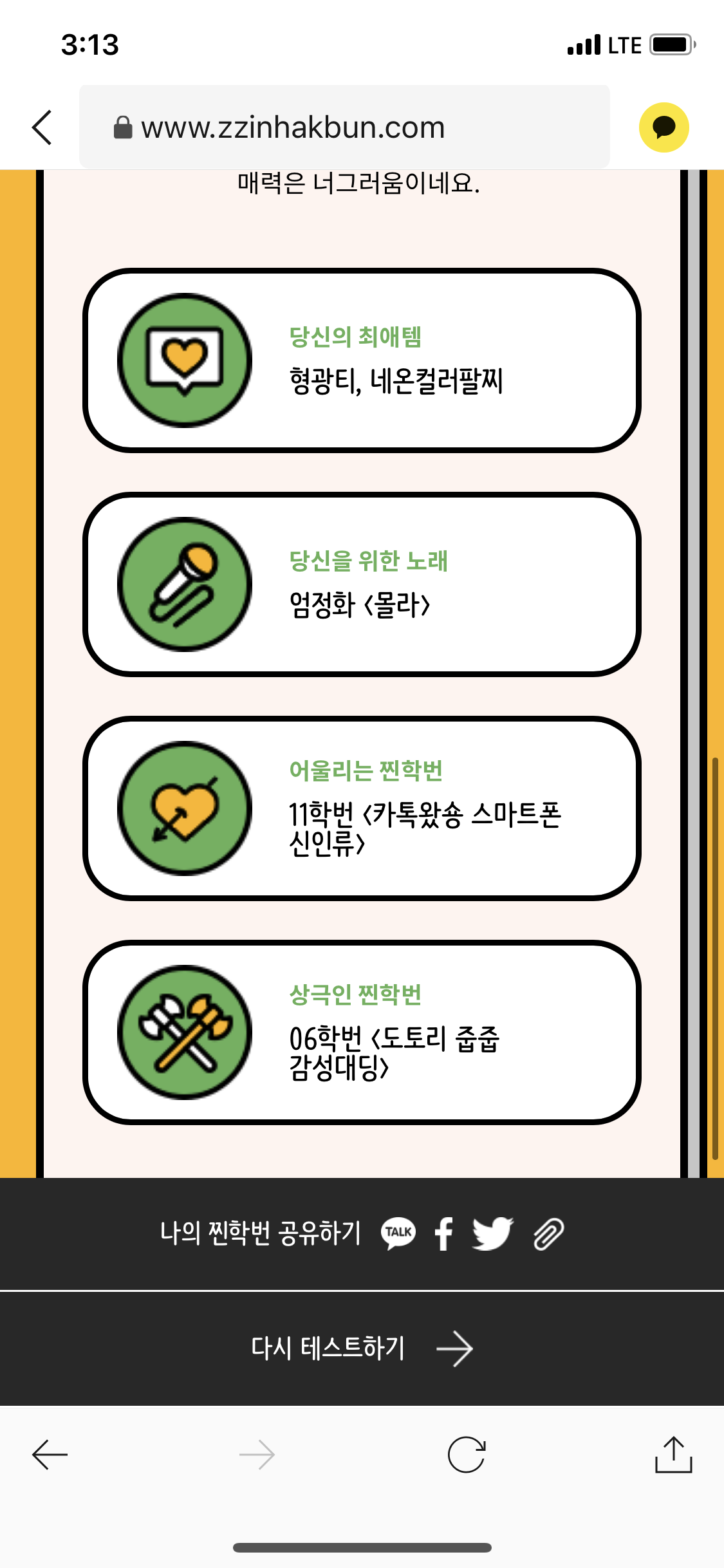 저와 어울리는 것들을 나열했는데 형광색...엄정화씨의 몰라... 어울리는 찐학번과 상극인 찐학번도 알려주네요 ㅎㅎ