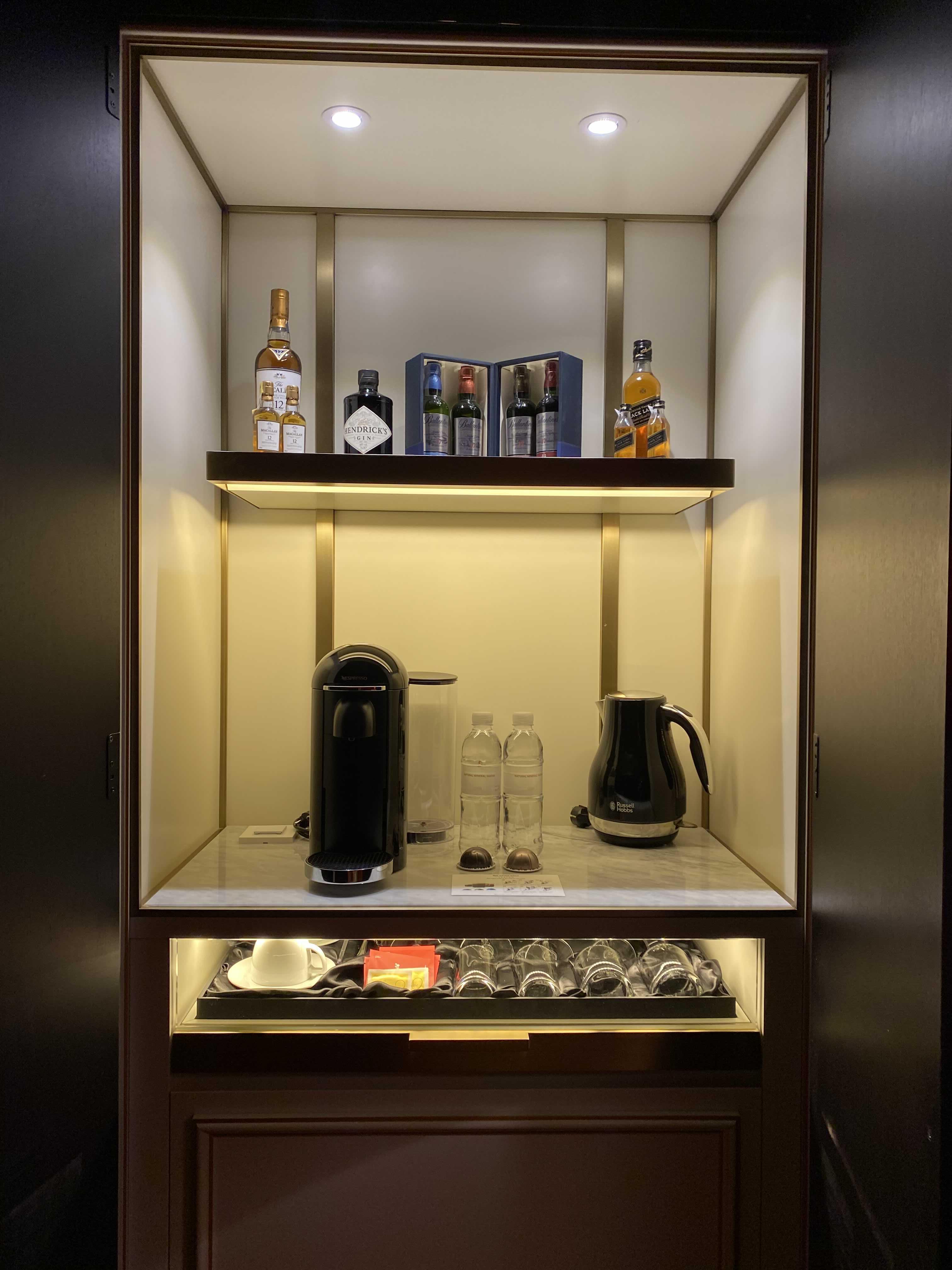 바 서비스입니다!! 물을 제외하고 이용시 돈을 내야한다는거는 다들 알고 계실거에요!! 비싸고 좋은 술도 많고 분위기도 있어요!! 커피머신도 있고 캡슐커피도 주고~~! 와인오프너부터 잔도 따로 정리가 되어 있어요!!