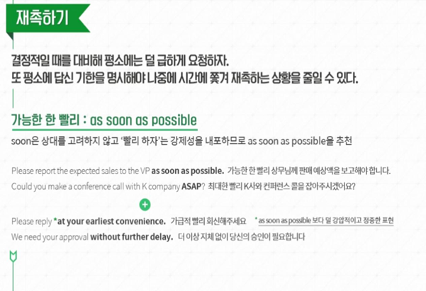 어떠한 때는 업무의 급박함이 있어 자료를 빨리 받아야하는 상황에서 이러한 재촉을 해야합니다!! 처음부터 이것은 너무 Urgent한 이슈니 빨리달라고 하면 진짜 중요한 순간에 못 받을 수도 있으니... 정중하게 부탁을 합시다!!