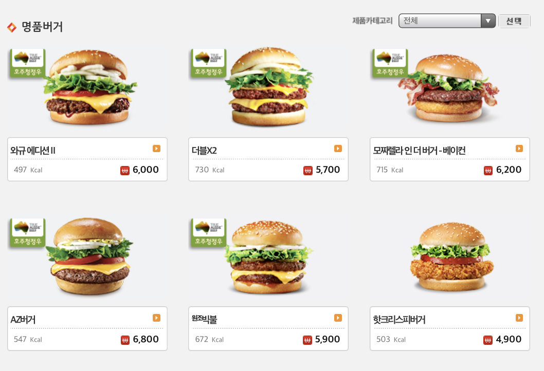 우선 명품버거에는 와규 에디션2, 더블X2, 모짜렐라 인 더 버거-베이컨, AZ버거, 원조빅불, 핫크리스피버거가 여기에 속하네요@@