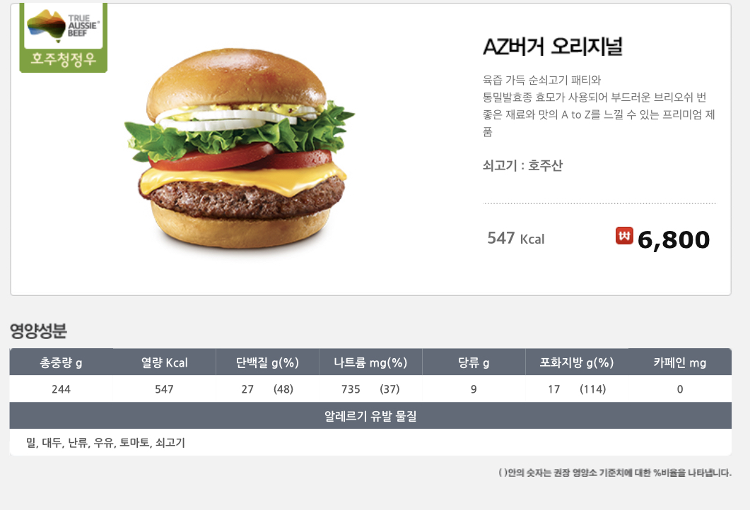 롯데리아 메뉴 추천!! 롯데리아 메뉴 베스트3 제일 첫번쨰는 AZ버거, 아재버거 오리지널입니다!! 이게 처음나왔을 떄 우연히 롯데리아를 가게되었는데 이게 제일 맛있어서 갈때마다 이것만 먹게 되었다는,.,, 무조건 비프버거는 AZ버거로 선정해서 매일 이것만 먹었습니다@@ 열량은 547KCAL이고 호주산 쇠고기를 이용했네요!!