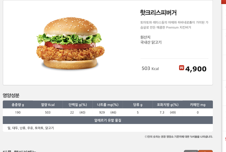 설명으로는 토마토와 레타스 등 야채와 하바네로즙이 가미된 가슴살로 만든 매콤한 Premium치킨버거라고 하네요@@