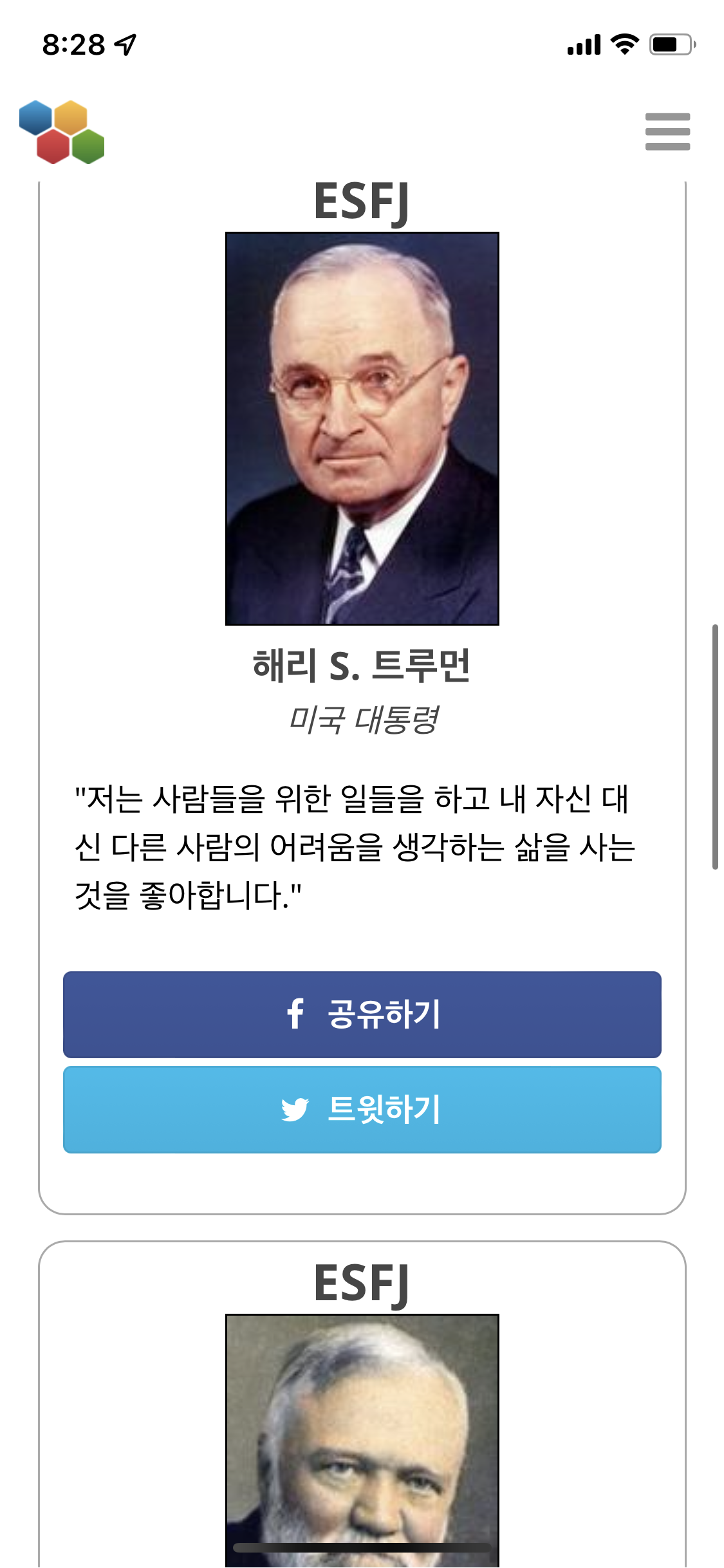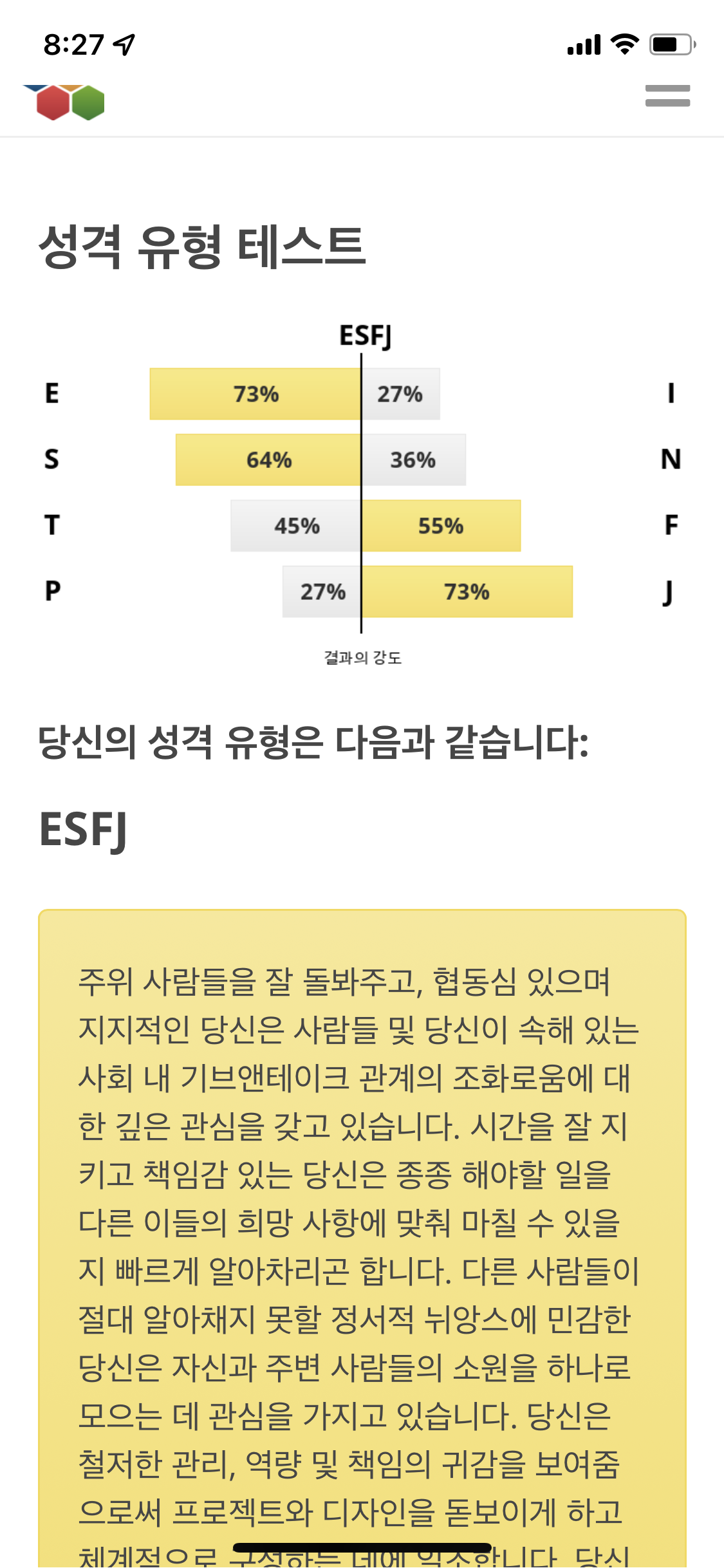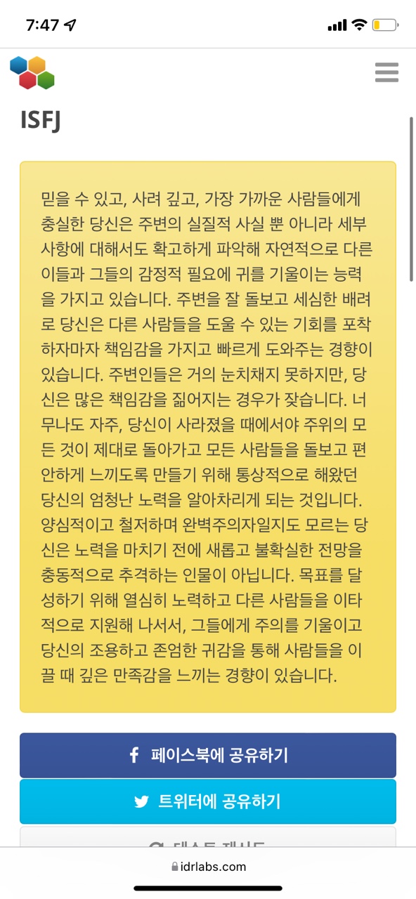 제 친구는 정확하게 똑같이 나왓다고 해서 더 놀라왔어요!! 저는 자주바뀌는데 이친구는 10번을 해도 똑같이 나온다고 해서..... ㅇ게 조금 신뢰가 가기 시작했어요!! ISFJ....