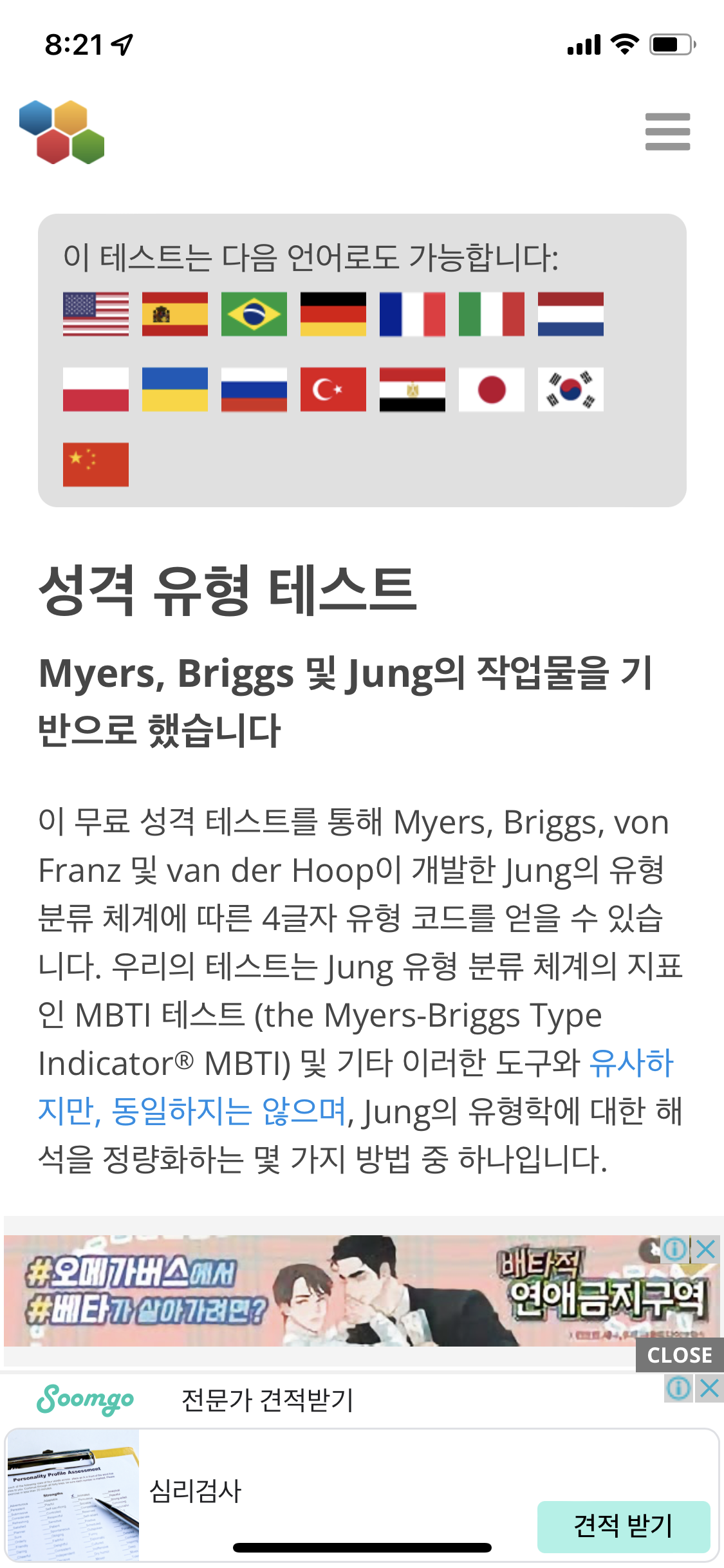 MBTI 고급버전 유사하지만 동일하지 않은...테스트라고 나오네요.. 광고가 너무 많아서 거슬리긴 하지만 그래도 할 만한 것 같습니다~!