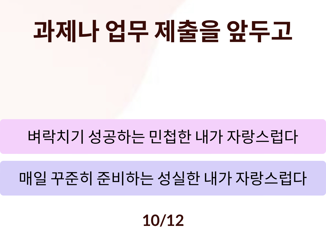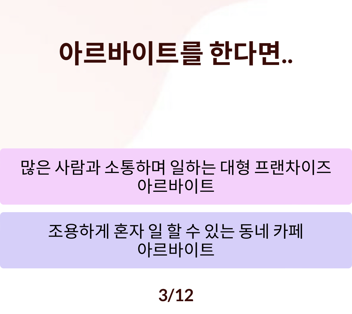 이러한 사소한 본인이 이상에서 겪을만한 일을 바탕으로 질문을 해요!! 12개의 질문으로 이루어져 있습니다!!