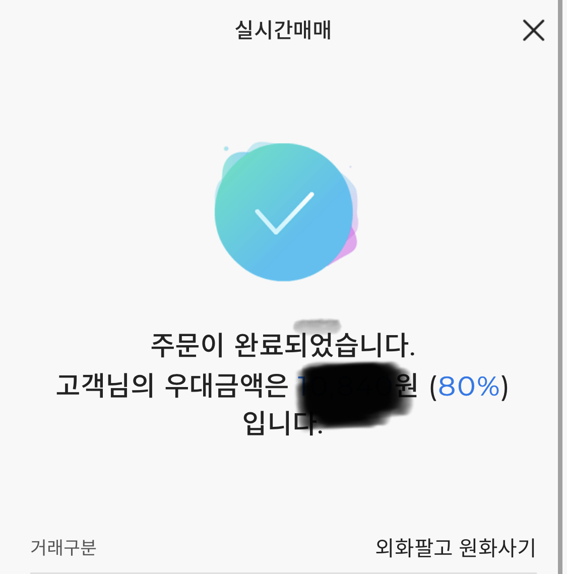 그럼 아래와 같이 실시간 매매 주문을 하시겠습니까라는 화면이 나오는데 거래 구분은 외화 팔고 원화 사기이고
