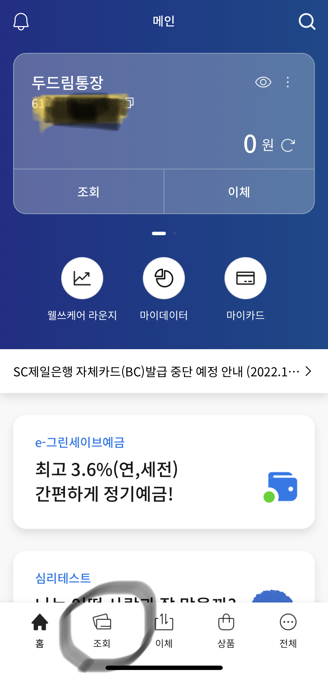 일단 sc제일은행 어플 들어가면 이렇게 메인에 이 통장이 나와 있을 거예요.