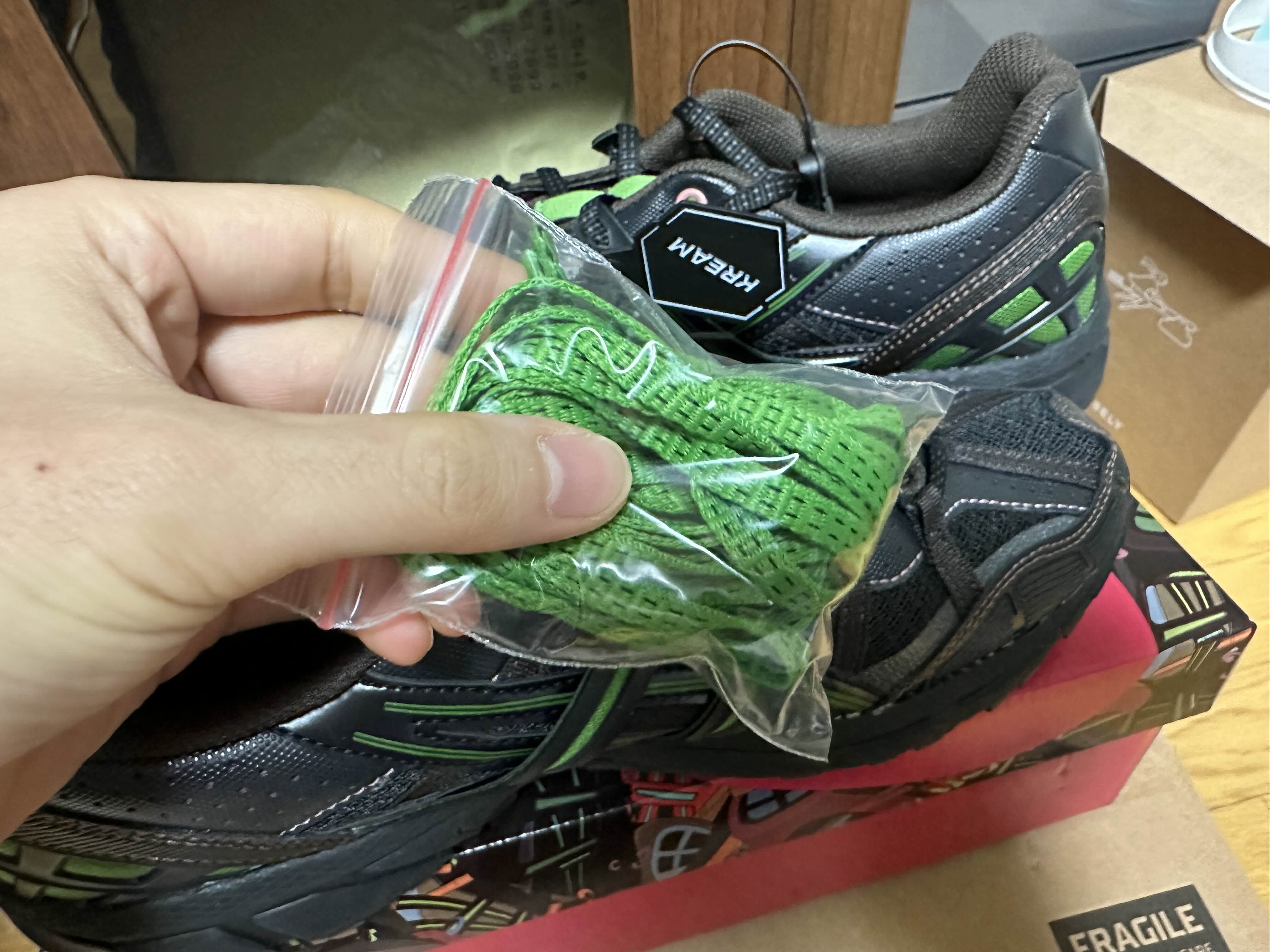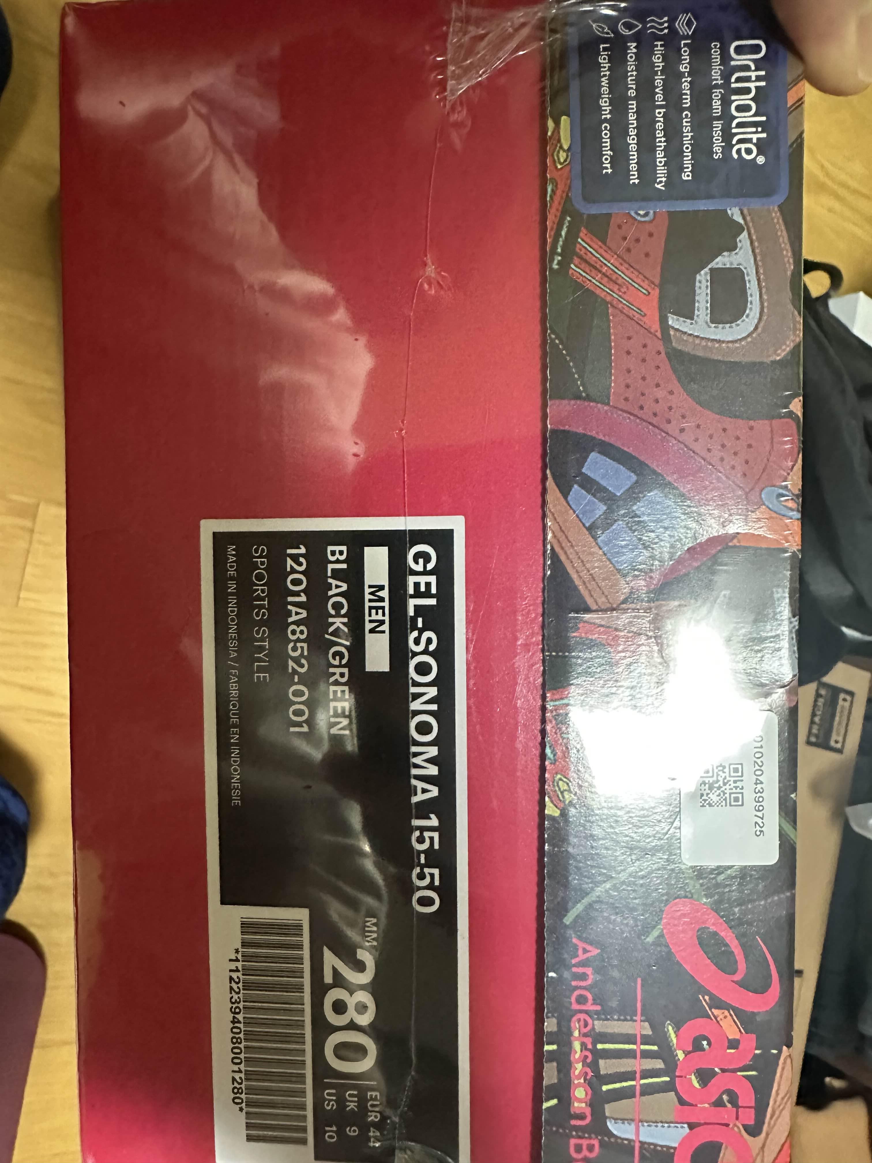 이게 배송 오고 나서 사진인데요. 저는 크림에서 구매했고 배송 시 이 신발 꽉을 보니까 앤더슨벨이랑 콜라보 한 게 명확하게 느껴지더라고요 멋있는 아식스 마크와 앤더슨벨이 콜라보 했다는 것을 볼 수 있는 신발 박스였습니다.